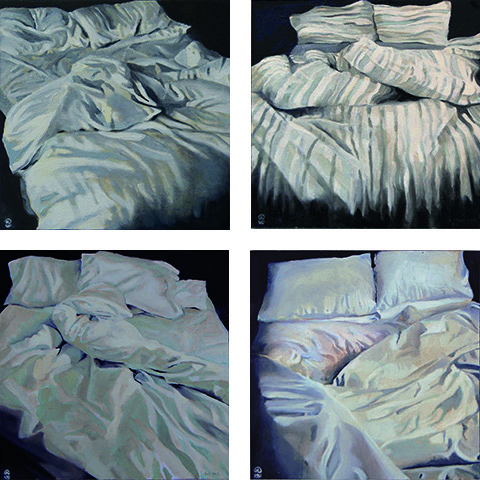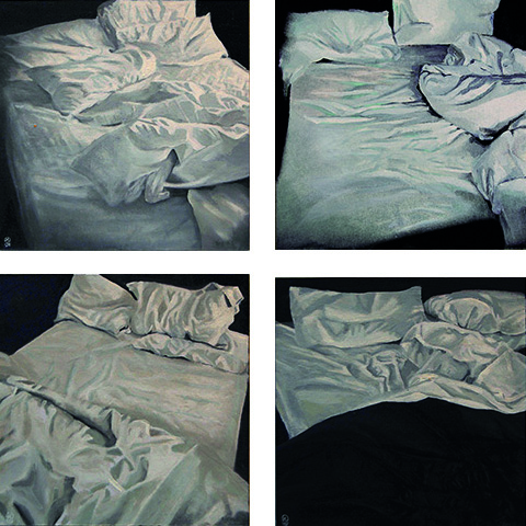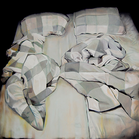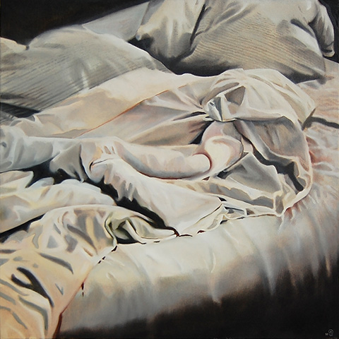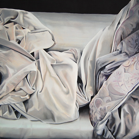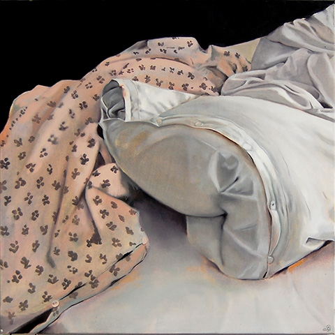 Die realen Leiber haben auf Langers Bildern den Schauplatz verlassen. Zurück geblieben sind ihre Abdrücke, ihre Hohlformen. Auch das ist ein ganz besonderer Reiz dieser Serie, wie sie die Bildfläche mit der stofflichen Plastizität ihres Gegenstandes auflädt. Dabei verwandeln sich die Tücher und Kissen plötzlich in groteske Ausstülpungen, wie ein Nachhall der Verrenkungen zuvor. Sind das Bandagen, Verbände? Fanden hier Verletzungen statt? Man meint Stümpfe zu erkennen, vielleicht versehrte Torsi ausgegrabener Körper von einst klassischer Vollkommenheit. Memento mori auch das.