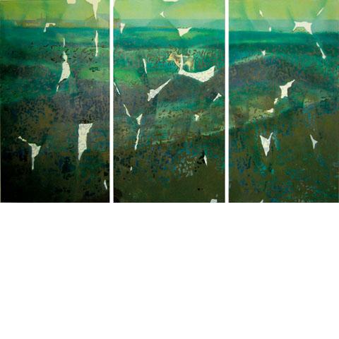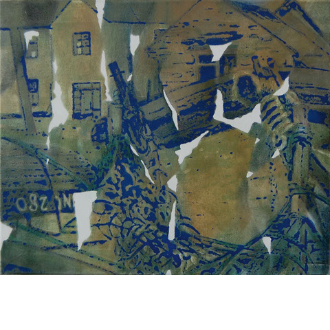 Trockensteinmauern kombiniert. Jede Arbeit besteht aus zwei unabhängigen Bildern, die in zwei Ebenen übereinander liegen. Die Löcher und Risse in den Steinmauern sind das optisch hervorspringende Merkmal der Arbeiten. Sie wirken als abstrakte Formen und verbinden die beiden Bildebenen miteinander. Gleichzeitig blenden sie aber auch Teile der Inselmotive aus und verweisen so auf den Prozess der Auflösung der Schutzfunktion und den damit verbundenen Verlust von Identität.