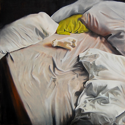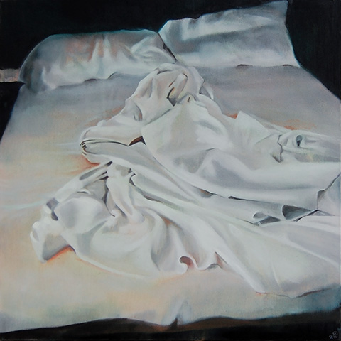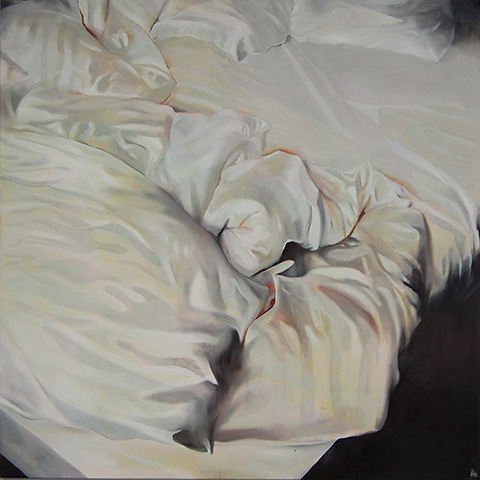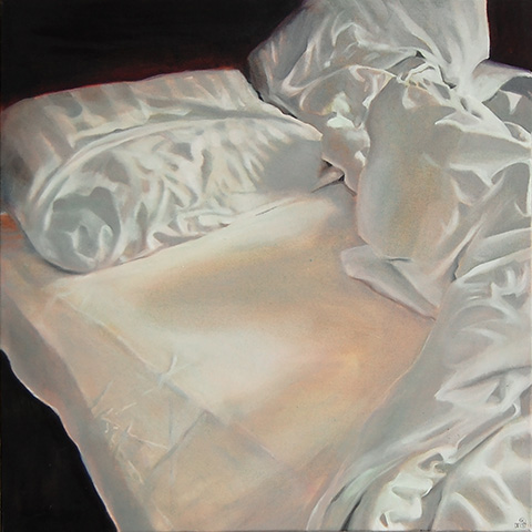 Die realen Leiber haben auf Langers Bildern den Schauplatz verlassen. Zurück geblieben sind ihre Abdrücke, ihre Hohlformen. Auch das ist ein ganz besonderer Reiz dieser Serie, wie sie die Bildfläche mit der stofflichen Plastizität ihres Gegenstandes auflädt. Dabei verwandeln sich die Tücher und Kissen plötzlich in groteske Ausstülpungen, wie ein Nachhall der Verrenkungen zuvor. Sind das Bandagen, Verbände? Fanden hier Verletzungen statt? Man meint Stümpfe zu erkennen, vielleicht versehrte Torsi ausgegrabener Körper von einst klassischer Vollkommenheit. Memento mori auch das.