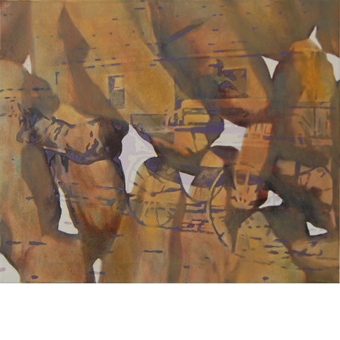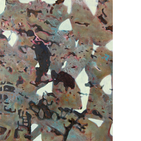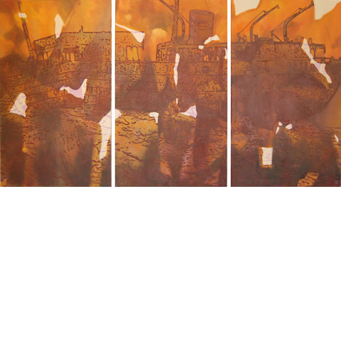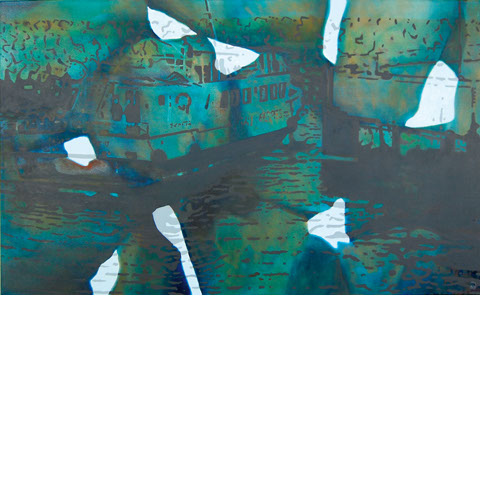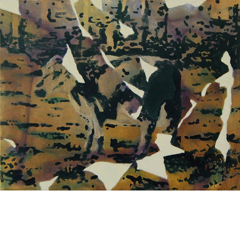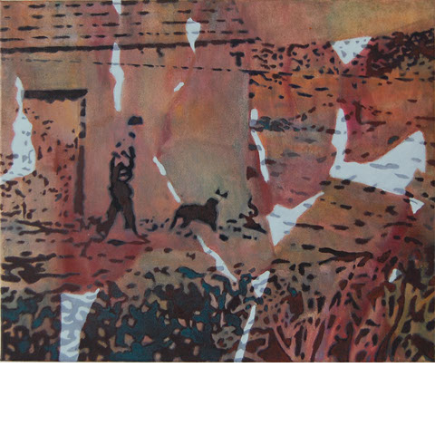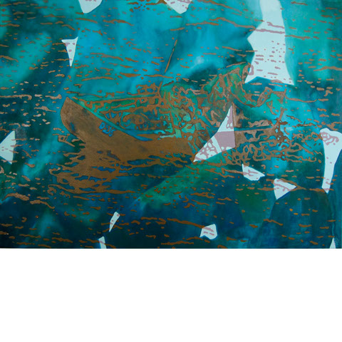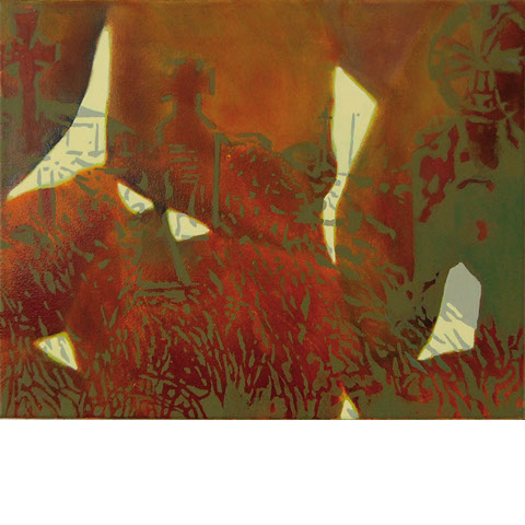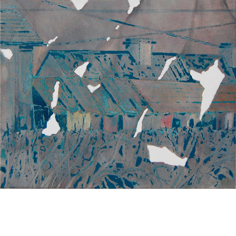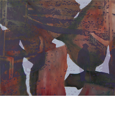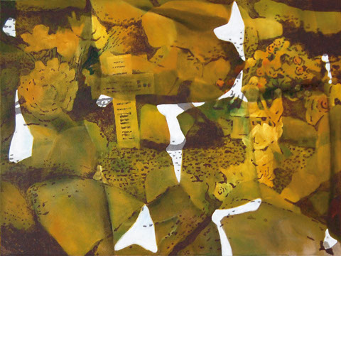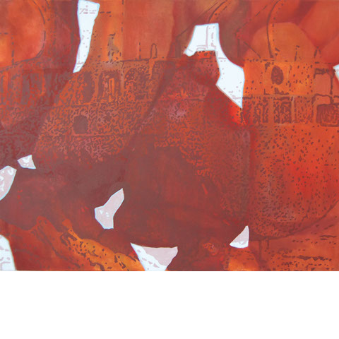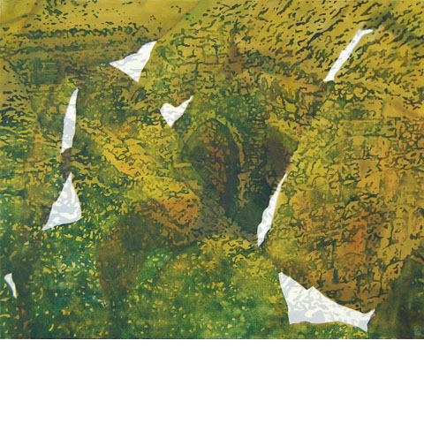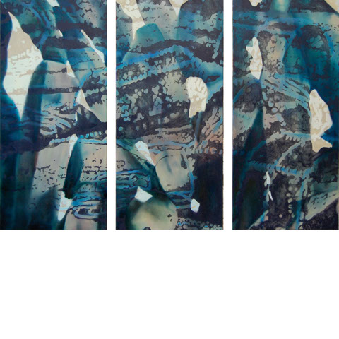 Trockensteinmauern kombiniert. Jede Arbeit besteht aus zwei unabhängigen Bildern, die in zwei Ebenen übereinander liegen. Die Löcher und Risse in den Steinmauern sind das optisch hervorspringende Merkmal der Arbeiten. Sie wirken als abstrakte Formen und verbinden die beiden Bildebenen miteinander. Gleichzeitig blenden sie aber auch Teile der Inselmotive aus und verweisen so auf den Prozess der Auflösung der Schutzfunktion und den damit verbundenen Verlust von Identität.